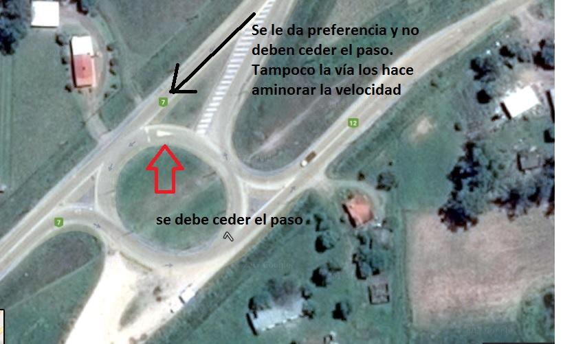 Pero con su implementación no se logró algo fácil de visualizar para quien lo enfrenta, o sea algo estandarizado. Si bien parece rotonda completa no funciona como tal. Quienes circulan por la ruta 12 rumbo a Tala al ingresar a la rotonda pierden preferencia sobre los que circula por la rotonda (correcto), sin embargo a diferencia de una rotonda completa, para salir e ingresar a la ruta 7 deben ceder el paso, en un punto con poca visibilidad dado como se detienen los autos. Y al haber dejado la vía rumbo a Tala tangente a la rotonda, la vía no propicia una reducción de velocidad como sí lo hace cuando es una rotonda completa estándar.
