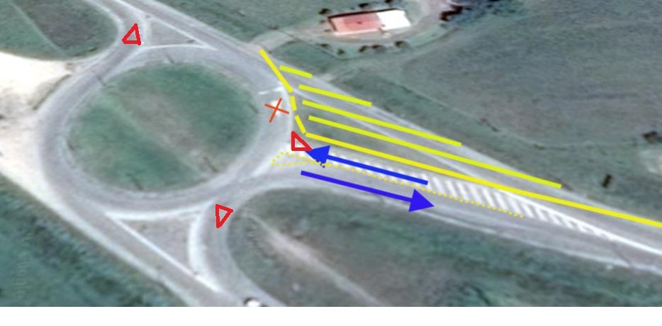 Para dar más seguridad y solucionar eso proponemos cerrar la vía tangente y canalizar por la vía ya existente, para transformarla en una rotonda completa casi estándar, de la siguiente manera: